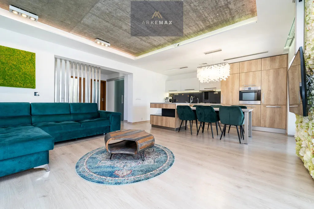 Dům nabízí promyšlené dispoziční řešení, které poskytuje dostatek soukromí i společného prostoru. Dominantou je prostorný obývací pokoj propojený s kuchyní a jídelnou, doplněný o relaxační a wellness část domu.