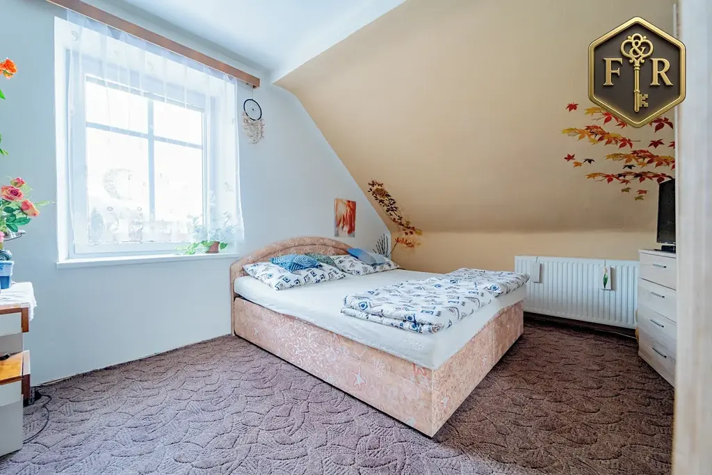 Dispozice domu je 5+kk (PP: sklady, kotelna; 1.NP: 2 pokoje, kuchyně, koupelna, WC; Podkroví: 3 pokoje, kuchyňský kout, balkon, WC)