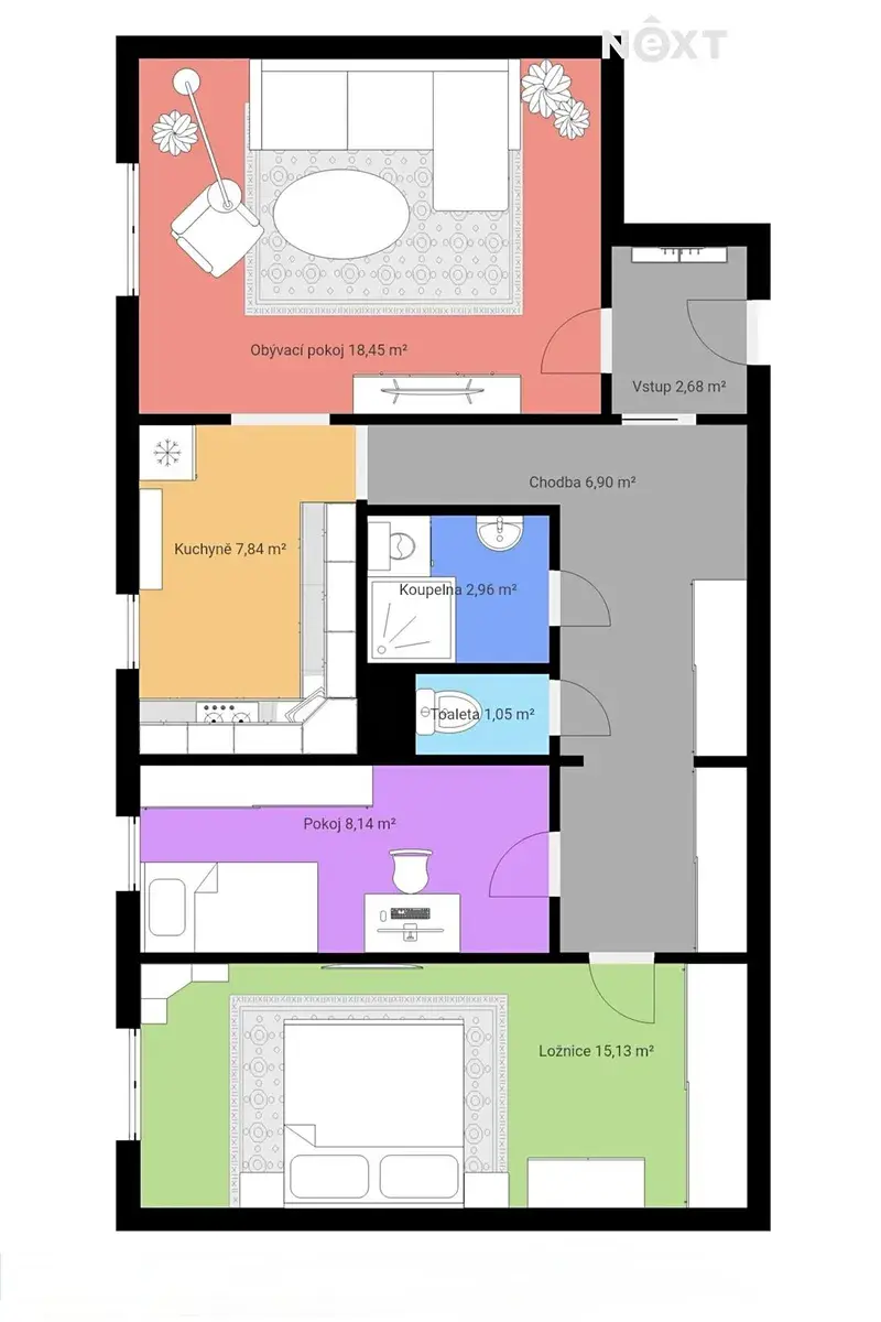 Dispozice bytu nabízí praktické rozložení místností s dostatkem prostoru pro rodinné bydlení i komfortní život jednotlivce či páru. Součástí bytu je také sklep, který poskytuje praktický úložný prostor.