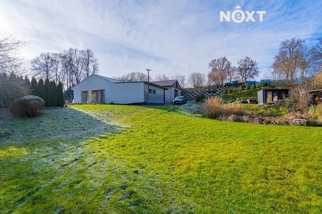 Na dům navazuje velká dvougaráž, která v současné době slouží jako autodílna. V ní je umístěn kotel na dřevěné pelety s rozvody do podlahového topení v celém domě, přičemž je možné připojit také elektrokotel. Ohřev vody zajišťuje elektrický bojler v technické místnosti. Dům byl budován postupně od roku 2019 a je před kolaudací, kterou zajistí stávající majitel. Objekt je zateplený, bude dokončena fasáda i venkovní dlažby okolo domu. PENB štítek je zadaný ve výrobě.
