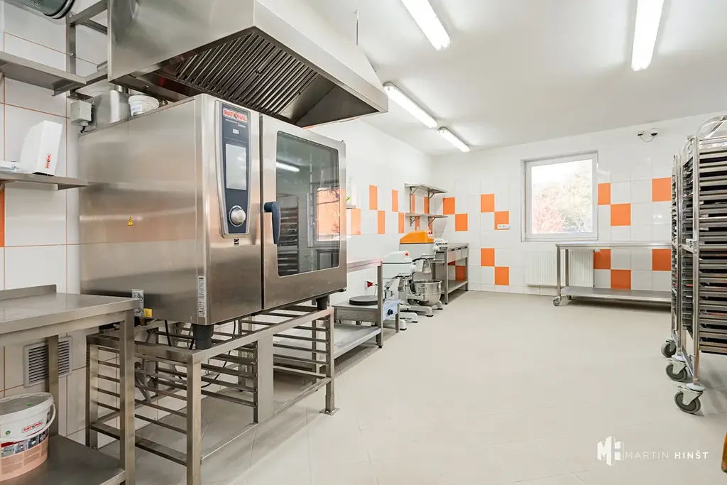 Nabízíme Vám pronájem kompletně vybaveného výrobního prostoru zkolaudovaného jako pekárna v obci Zlonín. Prostor o ploše 55 m² se nachází v přízemí patrového cihlového domu ve velmi dobrém stavu. Vybavení zahrnuje 4 malé a 1 velký nerezový stůl, 6 velkých a 1 malou nástěnnou nerezovou polici, 2 velké lednice, 1 velký mrazák, 1 plynový konvektomat s odsáváním, 1 velký a 1 malý mixér, 4 pojízdné nerezové stojany s plechy, nerezový dvojdřez a malé dřezy s výlevkami. Součástí je také šatna, WC, velká výlevka. Vytápění a ohřev vody je řešeno plynovým kotlem.