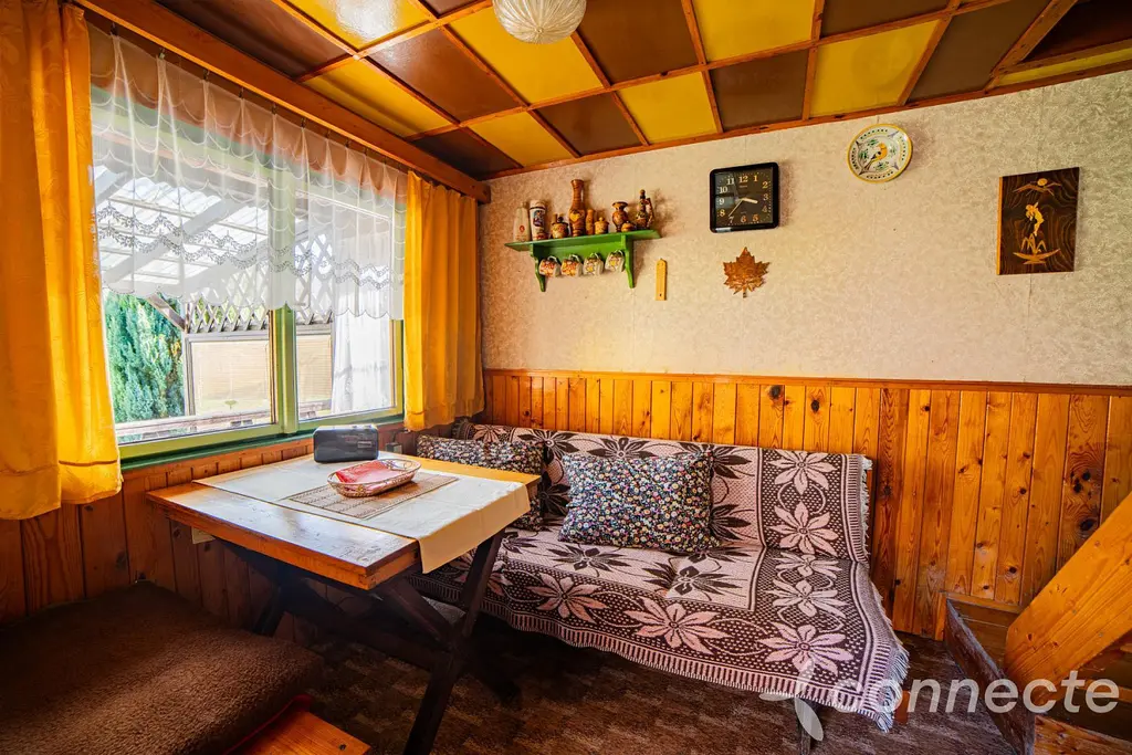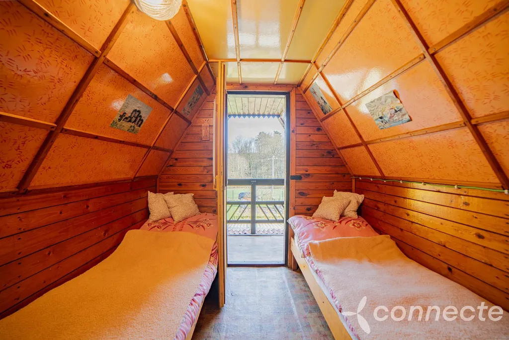 Chata nabízí obývací pokoj, menší kuchyňku a v patře ložnici. Z ložnice je vstup na balkon s výhledem do zahrady a na les na protější straně údolí. Příjemným bonusem je prostorná terasa a zastřešené posezení přímo před chatou.