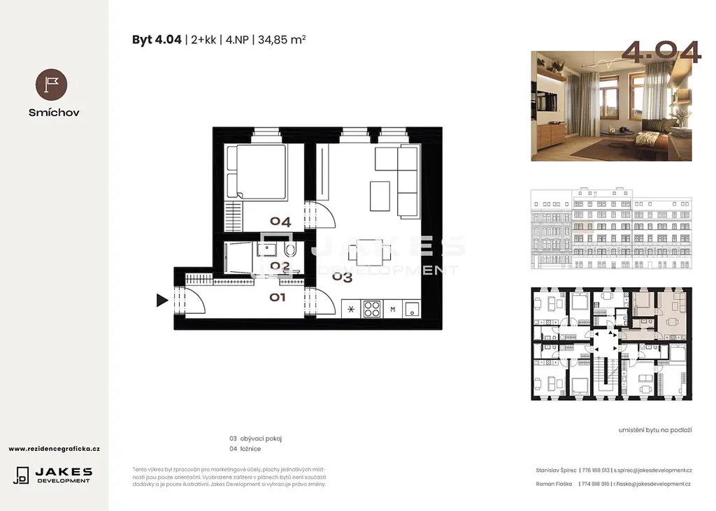 Nabízíme k prodeji byt 2+kk o celkové ploše 34,85 m², umístěný ve čtvrtém nadzemním podlaží developerského projektu Rezidence Grafická. Byt je orientován do klidné ulice, což zajišťuje příjemnou pohodu a dostatek soukromí. Provoz v ulici Grafická je minimální, díky čemuž nabízí bydlení tiché a nerušené prostředí. Je ideální volbou jak pro vlastní bydlení, tak pro investici s dlouhodobým potenciálem. Termín dokončení je 4Q/2026.