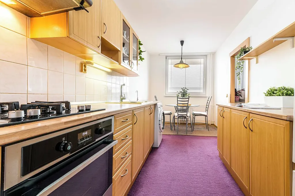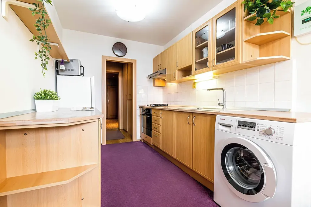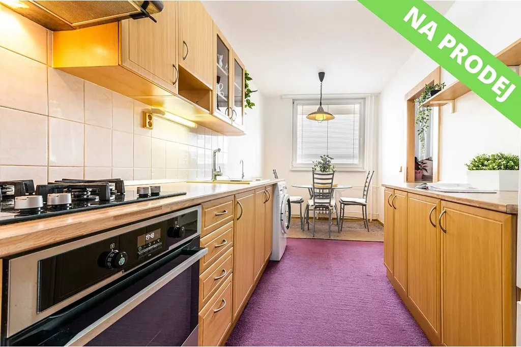 Kuchyně je prostorná a velmi prakticky řešená, nabízí dostatek místa pro každodenní vaření i rodinné fungování a tvoří přirozené centrum bytu.