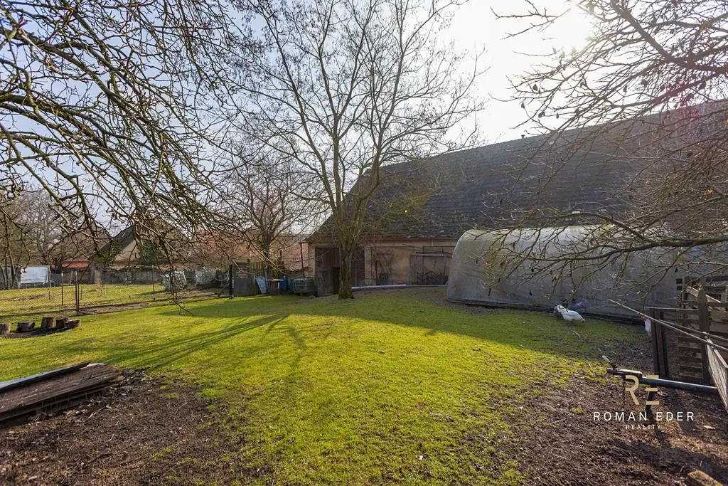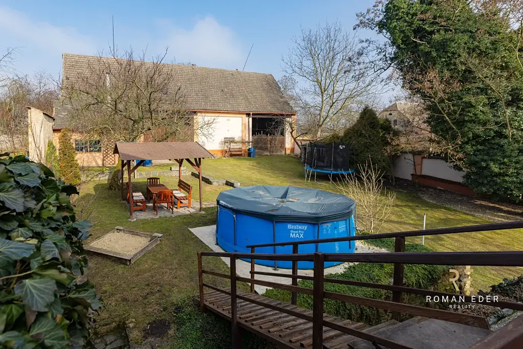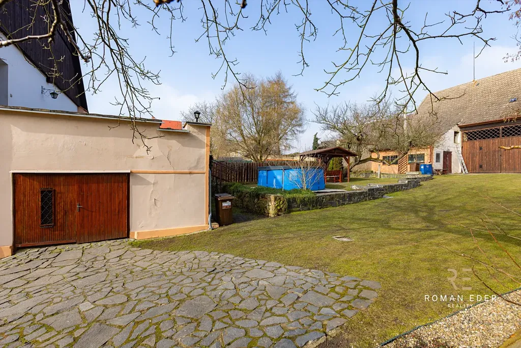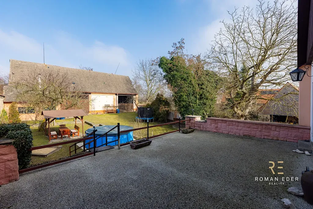 Součástí domu je také garáž a nad ní prostorná terasa s grilem, ideální pro rodinné posezení. Za domem pak naleznete velkou stodolu s dílnou. Za stodolou se pak nachází další část pozemku a navazující pole o rozloze 4 390 m², které je v současnosti pronajato zemědělcům za naturální plnění, takže se o něj nemusíte starat. Pozemek pod domem a stodolou má dalšch 1356m2.