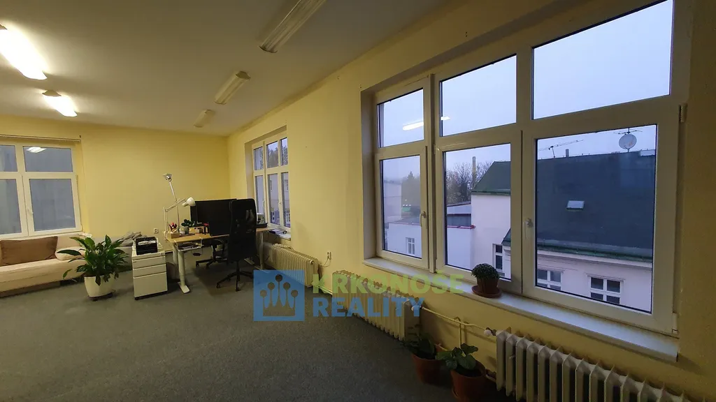 Nabízíme K pronájmu nabízíme místnost - kancelář o celkové výměře 56m² a s vlastním soc. zařízením, ve 3. nadzemním podlaží v Pražské ulici, v Trutnově, bez výtahu. Prostor je využitelný jako kancelář, ateliér, jednací místo, apod. Kancelář je zařízena částečně. Kancelář se nachází v centru města hned nad Krakonošovým náměstím. Prostory mají velká okna, s výhledem na hory, proto je dostatek světla a klid na práci. Nájemné 6.500,- Kč/měsíc a záloha na služby 6.000 Kč/měsíc tj. služby a energie (elektřina, voda, topení, úklid chodba, popelnice).