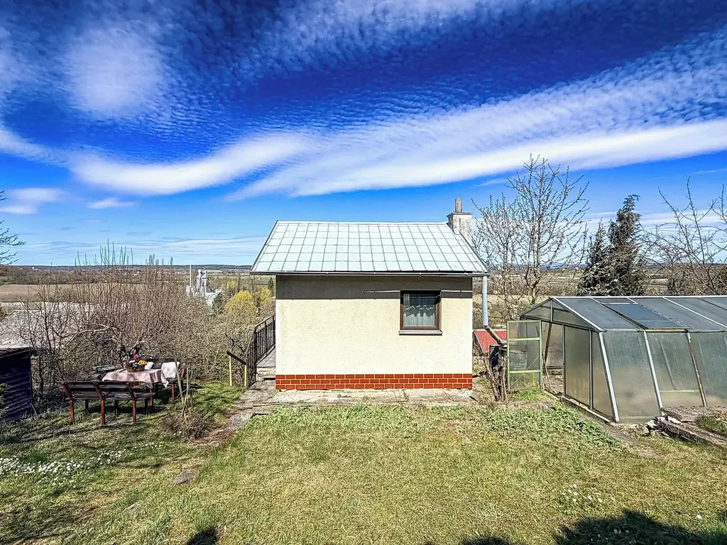 Jedná se o zděnou chatu na kamenném sklepě se sedlovou střechou. Stojí ve stráni, takže sklep je přístupný ze spodní zahrady. Tvoří ho 3 místnosti, kde můžete uskladnit vypěstovanou zeleninu a ovoce, uskladnit nářadí a nebo umístit chemickou toaletu.