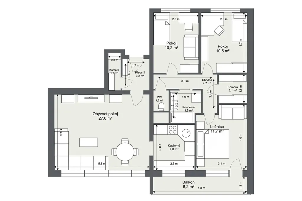 3 samostatné ložnice 10,2 m², 10,5 m² a 11,7 m²