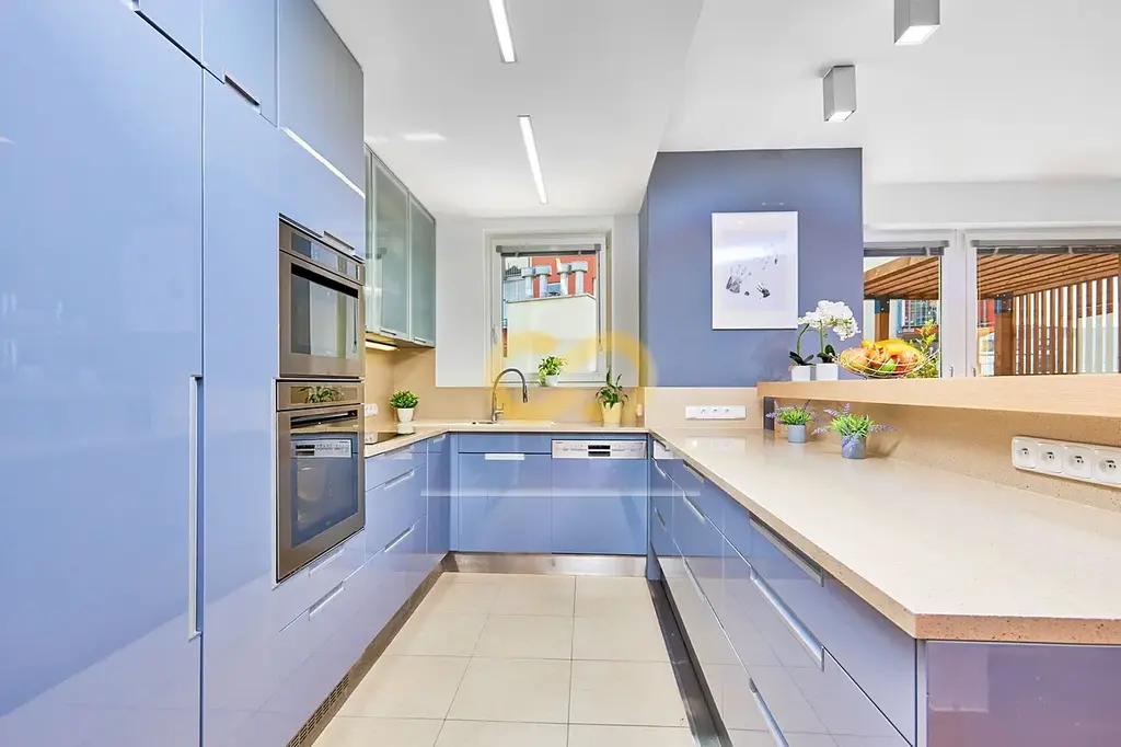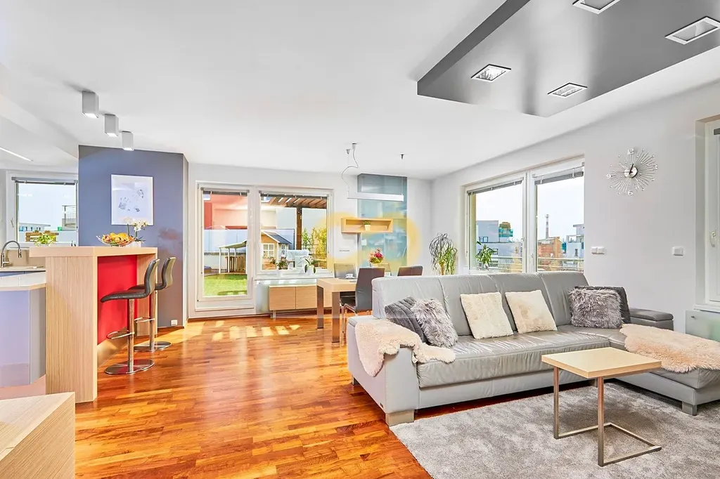 Obývací pokoj o výměře téměř 46 m² je krásně světlý a balkonovými dveřmi z něj projdete rovnou na terasu. Kuchyňská linka do U je vybavená vestavěnými spotřebiči a má i barový pult.