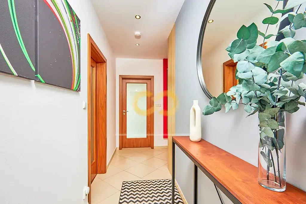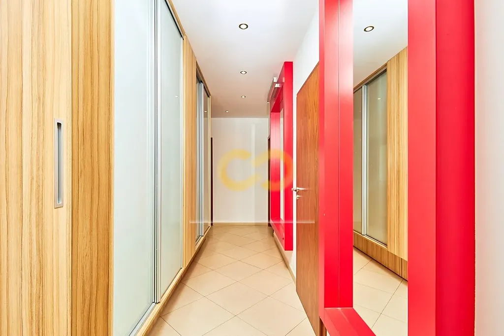 Byt má dispozici 4+kk a výměru 120 m². Skládá se z obývacího pokoje s kuchyní, tří pokojů, dvou koupelen a komory. K bytu patří terasa o velikosti 190 m², garáž, parkovací stání a sklep.