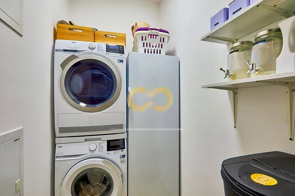 O úložné prostory tu nebudete mít nouzi. V předsíni jsou vestavěné skříně od podlahy ke stropu a v komoře schováte pračku se sušičkou i úklidové potřeby.