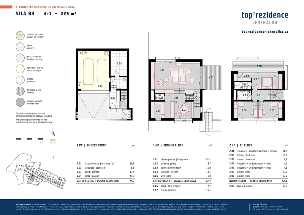 Ve standardní dispozičním uspořádání 5+kk nabízí vila typu B v 1. NP vzdušný obývací pokoj se světlou výškou 3,4 m s kuchyňským koutem, výstupem na terasu a zahradu. Přes zvýšenou galerii můžete pokračovat do hostinského pokoje s koupelnou, případně do 2. NP, kde je umístěna hlavní ložnice s terasou a vlastní koupelnou a další dva pokoje se sdílenou koupelnou.