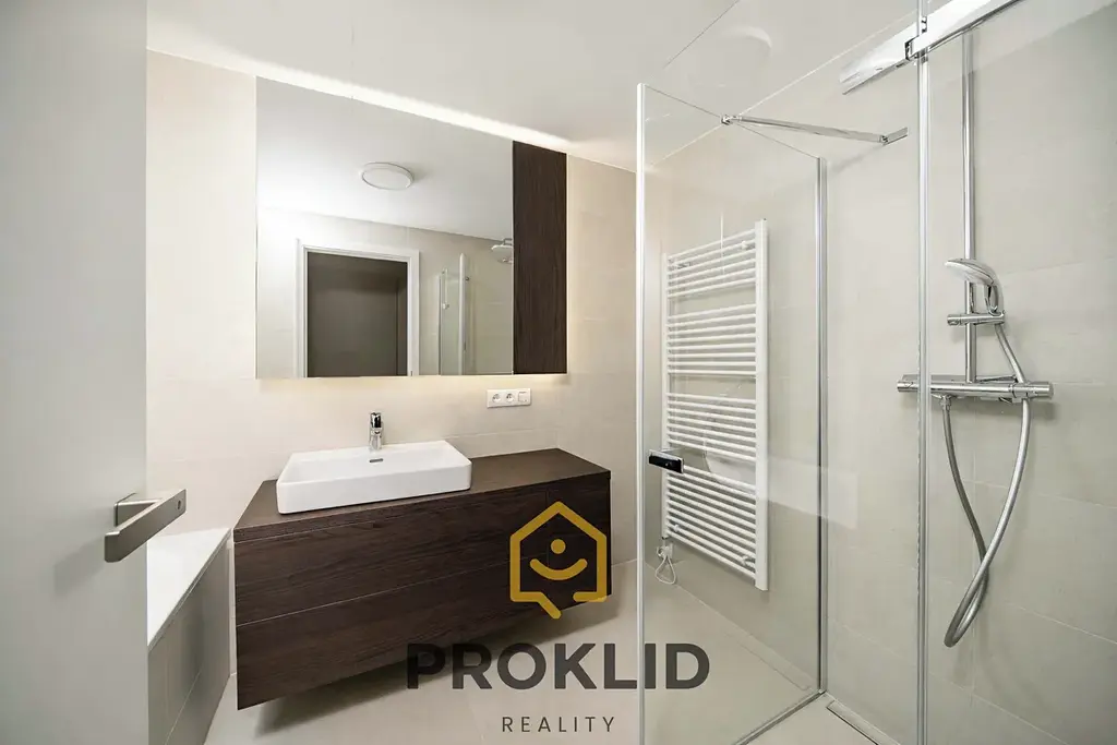 podlahové topení po celé ploše bytu, podlaha srovnaná nivelační hmotou – podlaha bez přechodových lišt, lepený zátěžový vinyl, př. klimatizace, venkovní stínící žaluzie, 2x výsuvná el.markýza, prakticky řešené zásuvky a vypínače (například větší počet zásuvek v kuchyni a v prostorném dětském pokoji, u kterého se do budoucna uvažovalo s rozdělením na 2 menší, tedy o dispozici 4+kk), posuvné skleněné dveře se skrytým pouzdrem do obývacího pokoje, dveře vyšší velikosti 210 cm, které mají zabudovaný zámek přímo v klikách, sprchový kout bez vaničky.