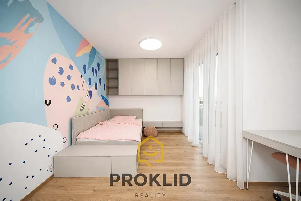 Dominantou bytu není jen prostorný dětský pokoj, ale také obývací pokoj s kuchyní a jídelním koutem, ze kterého je přímý vstup na balkon, kde si příjemně vychutnáte svou ranní kávu nebo odpolední západ slunce.