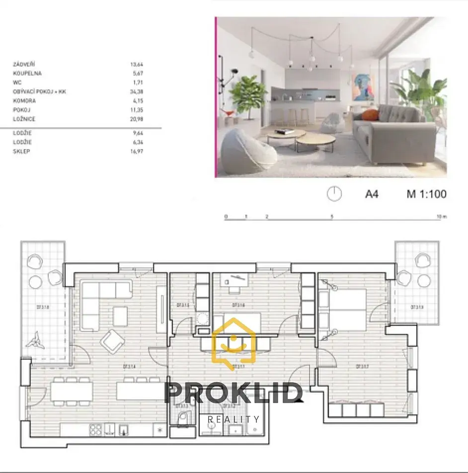 Byt o celkové užitné ploše (108m²) včetně dvou lodžií (17m²).