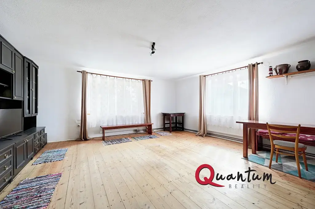 Dominantou domu je prostorný a světlý obývací pokoj s kvalitní dřevěnou podlahou a možností vytápění kamny na tuhá paliva. Na něj navazuje kuchyně s původními kamny na vaření, která dodávají prostoru jedinečný charakter, a prakticky řešenou kuchyňskou linkou. Další dva pokoje jsou průchozí, oba nadstandardně prostorné – jeden s dřevěnou podlahou, druhý s kobercem.
