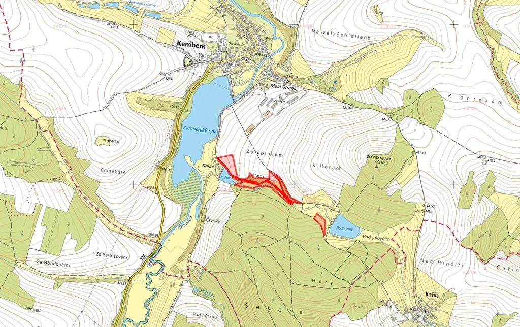 Pozemky jsou zapsány na listu vlastnictví 528 a jedná se o parcely: 653/1, 655/2, 656/2, 789/1, 789/6, 789/7, 794/2, 4121, 4122, 4124, 4126, 4130. Pozemky se rozprostírají podél vodních ploch a lesa.