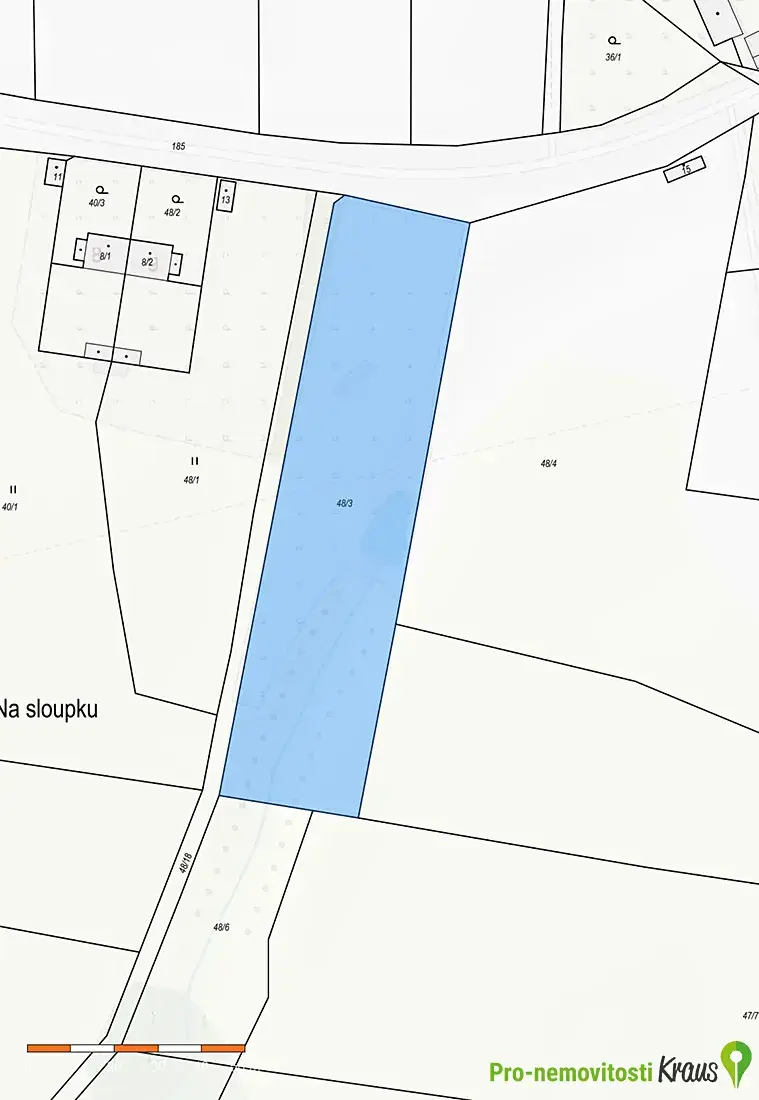 Severní část pozemku o výměře zhruba 1400 m² je dle územního plánu zastavitelná, zbytek pozemku je nezastavitelný a může sloužit jako zahrada. Pozemek má praktický obdelníkový tvar, je orientovaný a lehce svažitý na jih, což je zárukou dostatku slunečního svitu a krásného výhledu do krajiny.