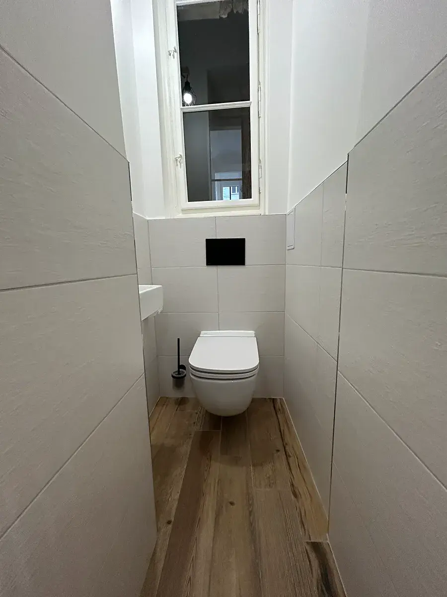 Nově zrekonstruovaná moderní koupelna se sprchovým koutem, skříňkou a zrcadlem. V koupelně instalován plynový kondenzační kotel Buderus, přívod na pračku a sušičku.