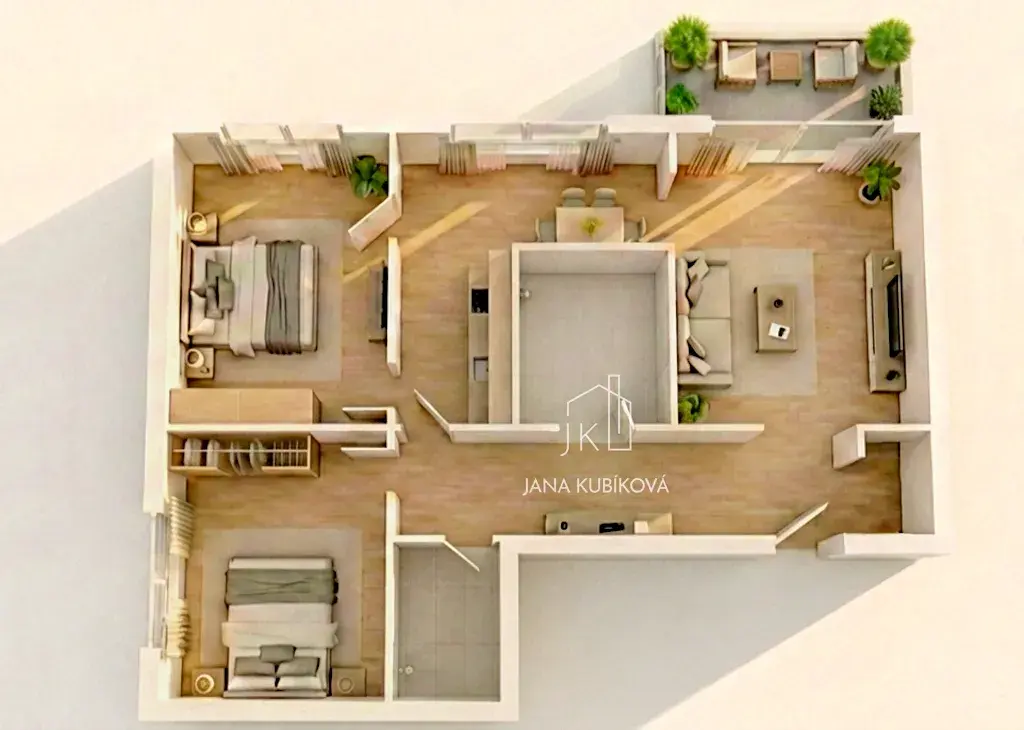 Byt je velmi prakticky řešený a nabízí dostatek prostoru pro rodinu i jednotlivce, kteří ocení samostatné pokoje a dostatek úložných možností.