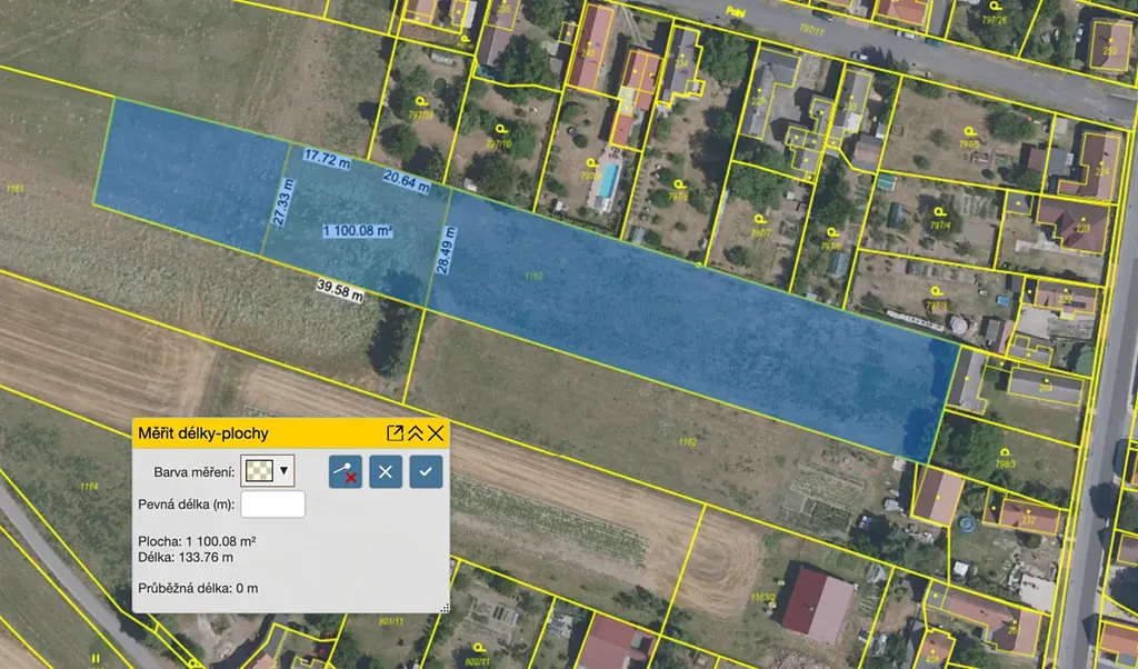 Jednotlivé parcely mají plánované výměry 835 m2, 840 m2, 820 m2 a 1100 m2. Součástí nabídky je společná příjezdová komunikace o šířce 8 m s plochou cca 1 233 m2. Celková výměra činí 5617 m2.