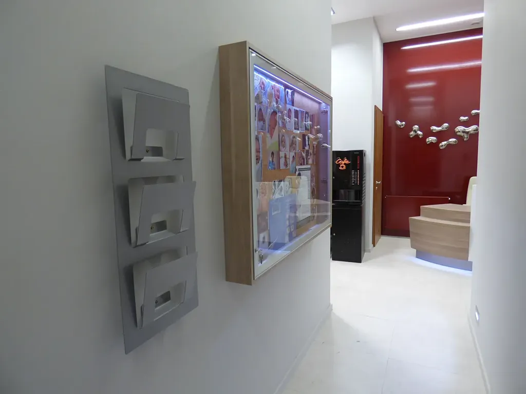 Prostory jsou doslova ,,vymazlené“ do posledního detailu. Nábytek na míru vč. kartotéky, skřínky, pracovní stoly, židle, lednička, trezor, umyvadlo, a prostoru pro převlékání pacientů. Stylová recepce s podsvíceným recepčním pultem, židlemi, automatem na kávu, výstavní vitrínou.