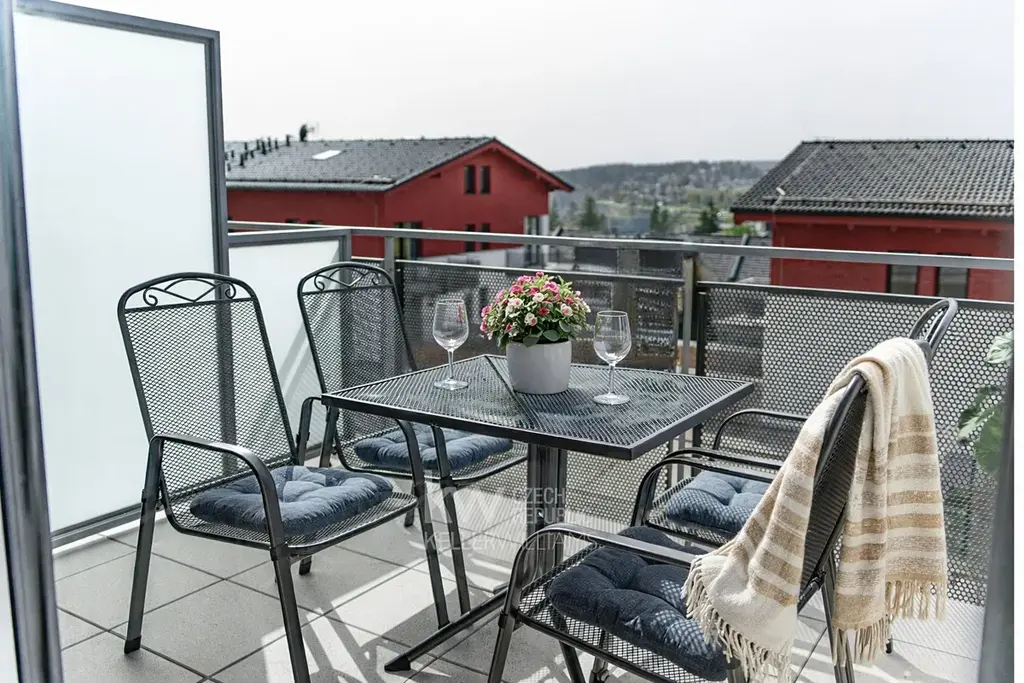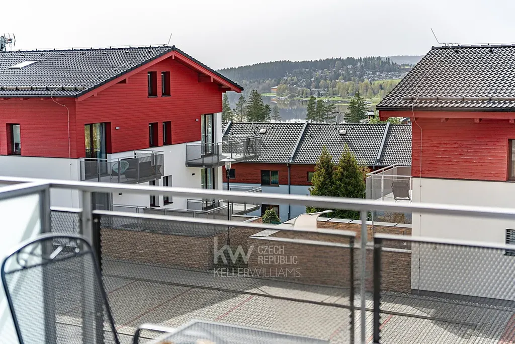 Západní orientace zajišťuje příjemné světlo po celý den. Z balkonu je výhled směrem k jezeru - ideální místo na ranní kávu i večerní sklenku vína po dni v přírodě.
