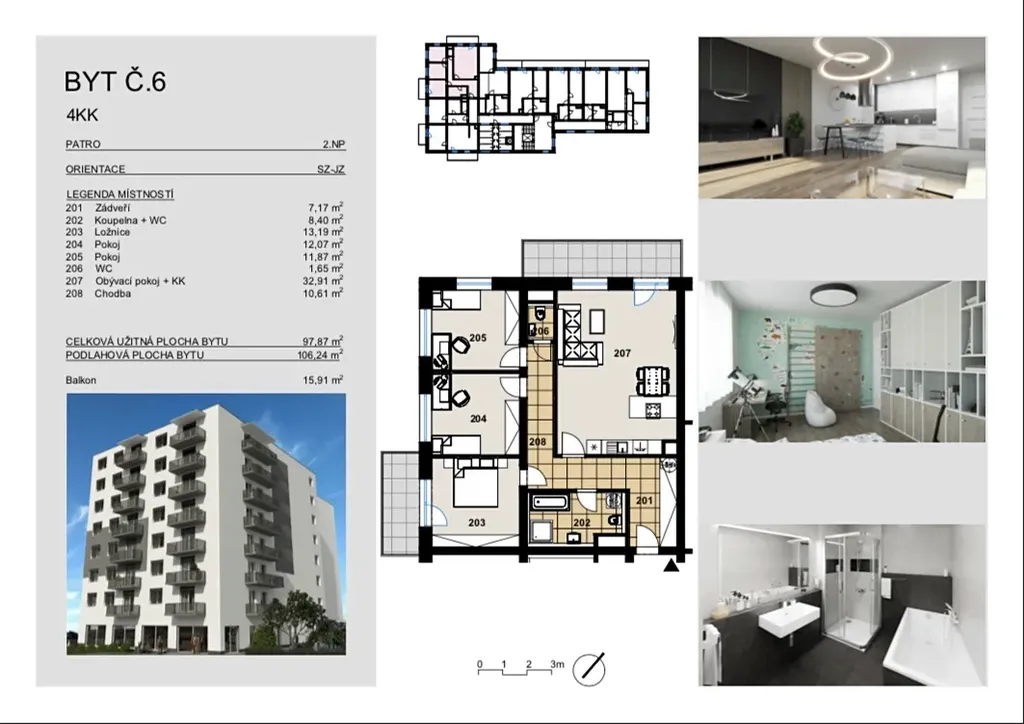 Tato konkrétní bytová jednotka o dispozici 4+kk, se nachází ve 2.np/8np. nově zbudovaného bytového domu s výtahem a je v projektu označena jako jednotka 1.B6.