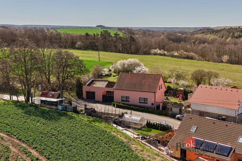 K domu náleží prostorná zahrada, na které se nachází zahradní domek poskytující další úložný prostor, skleník a vzrostlé ovocné stromy (meruňky, třešně, jabloně). Pro rodiny s dětmi je zde připravena i dětská prolézačka. Na pozemku je rovněž vrtaná studna s možností obnovení využití.