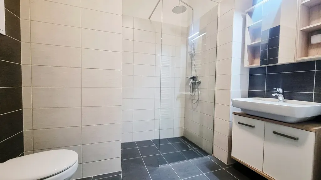 Koupelna (4 m²) má sprchový kout, umyvadlo se skříňkou, přípojku na pračku a toaletu.
