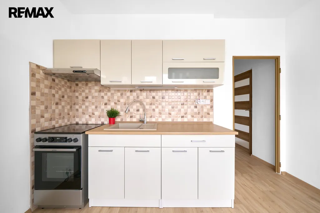 Dispozice bytu nabízí kuchyň, samostatný pokoj, koupelnu se sprchovým koutem a toaletou, předsíň a sklepní kóji. Kuchyň je vybavena kuchyňskou linkou, sklokeramickým sporákem značky Gorenje a praktickou potravinovou skříní.