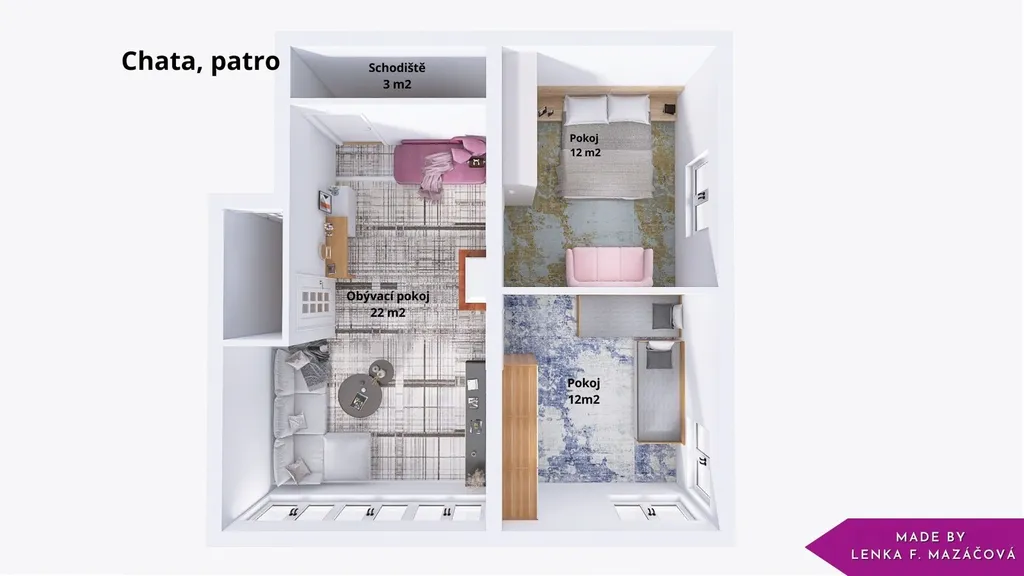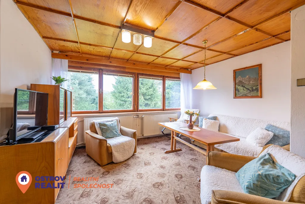 V podkroví se aktuálně nacházejí dvě ložnice a prostorný obývací pokoj s velkým oknem přes celou stěnu, které nabízí krásné výhledy do okolní zeleně a zároveň propouští spoustu denního světla. Tento vzdušný prostor bez problému pojme celou vaši rodinu – každý si tu najde své místo a pohodlí.
