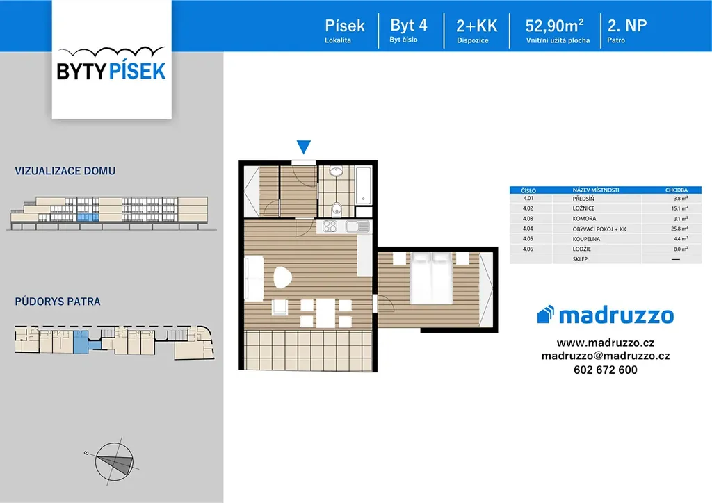 Nabízíme Vám prakticky řešený byt č. 4 o dispozici 2+kk a velikosti 52,9 m2 s prostornou lodžií o velikosti 8 m2 umístěný ve 2. NP. Ideální bydlení pro páry, chytře řešená dispozice nabízí více možností interiérového řešení.