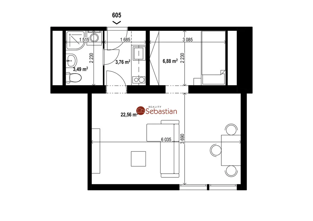 Byt 1+1 v 6. nadzemním podlaží po kompletní rekonstrukci o celkové rozloze 36,43 m2 orientovaný na západní stranu. Byt 1+1 v 6. nadzemním podlaží po kompletní rekonstrukci o celkové rozloze 36,43 m2 orientovaný na západní stranu. Byt je vhodný pro dvě až tři osoby.