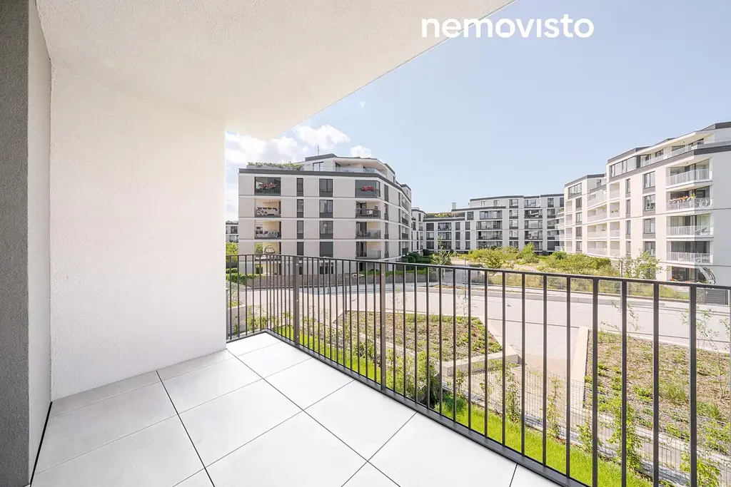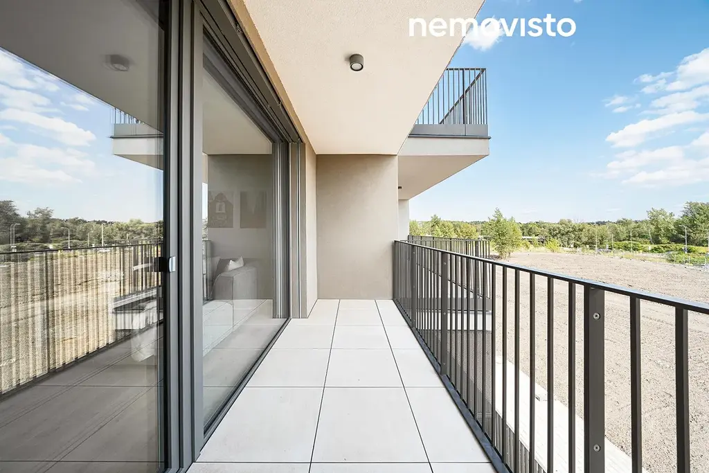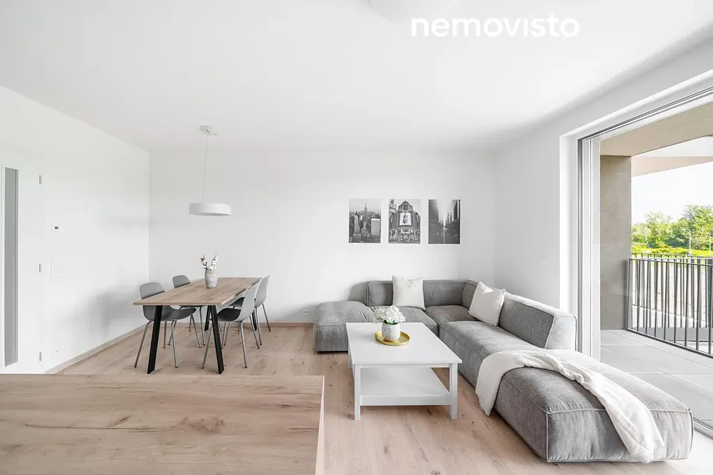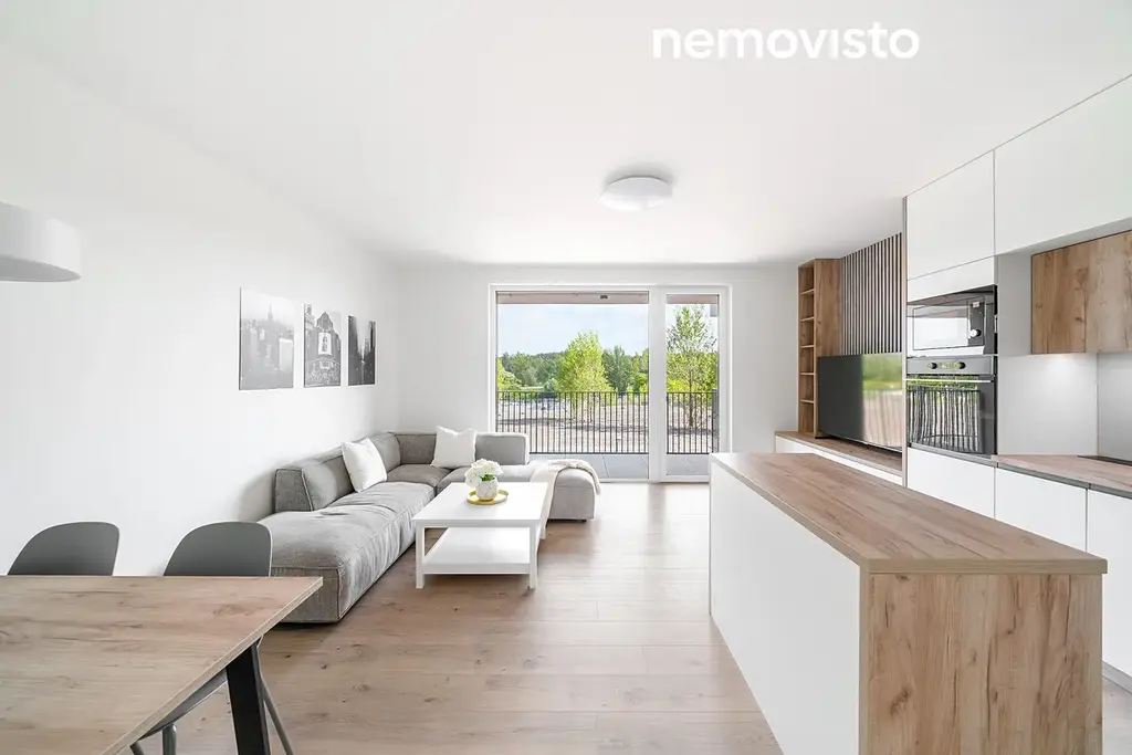 Moderní bytová jednotka číslo B54 o dispozici 3+kk se dvěma terasami splňuje ty nejvyšší nároky na komfortní bydlení. Posuďte sami. Obývací pokoj s kuchyňským koutem o výměře 27 m2 nabízí přímý vstup na prostornou terasu. Kuchyňská linka na míru je vybavena vestavěnými spotřebiči (indukční varná deska, digestoř, horkovzdušná trouba, mikrovlnná trouba, myčka nádobí a lednice) a vybavena kuchyňským ostrůvkem. Nechybí jídelní stůl, židle, sedačka nebo televize. Maximální komfort zajistí elektrické venkovní žaluzie a podlahové vytápění v každé místnosti.
