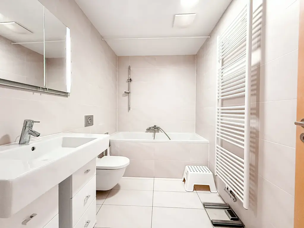 Byt nabízí velkorysý otevřený obytný prostor s plně vybaveným kuchyňským koutem, vstupní halu s dostatkem úložných prostor, koupelnu s vanou a toaletou a samostatnou šatnu / technickou místnost s pračkou. Veškerý nábytek zobrazený na fotografiích zůstává součástí bytu, včetně rozkládací pohovky.