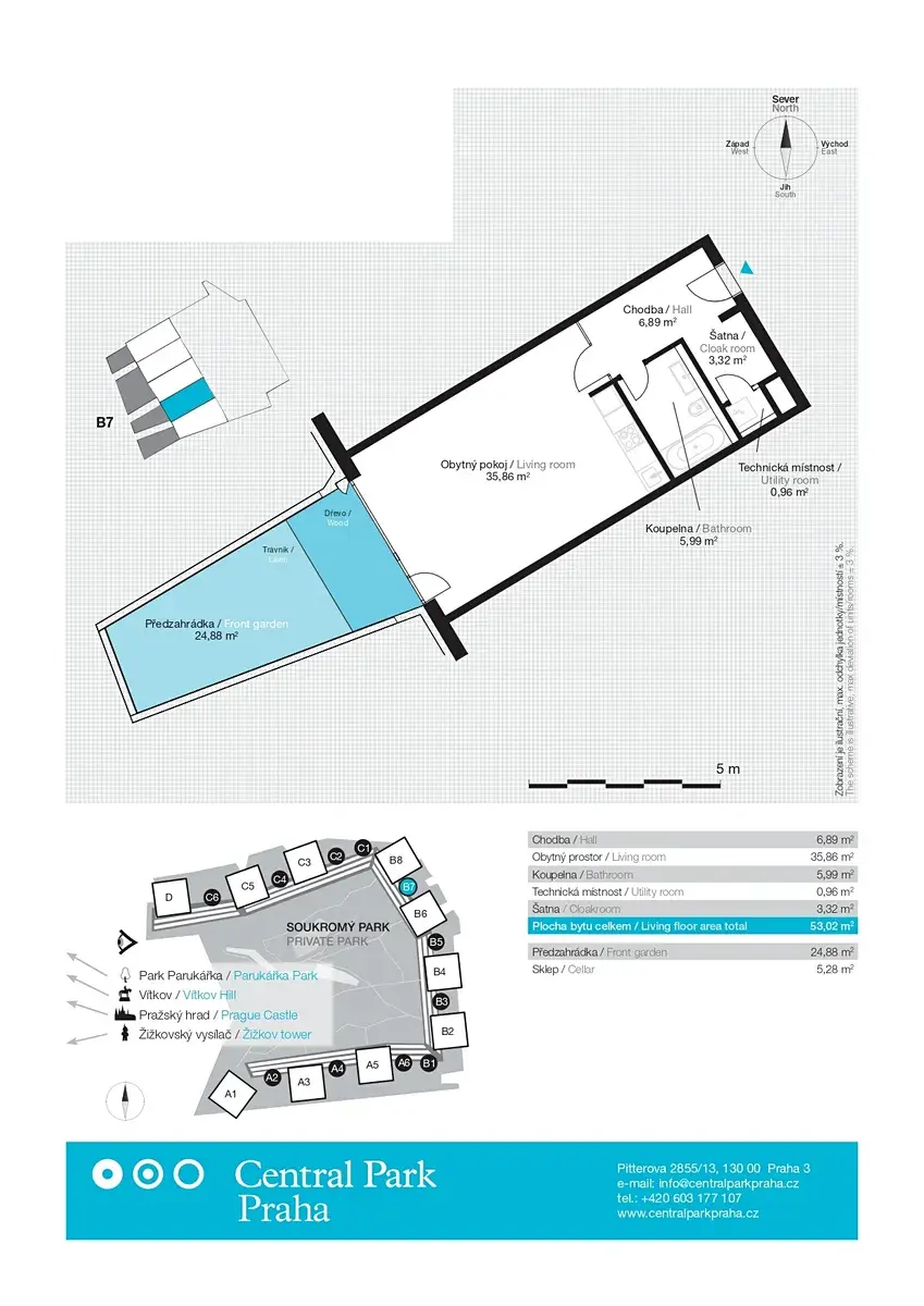 Nabízíme k pronájmu prostorný a světlý byt o dispozici 1+kk a ploše 53,02 m² s privátní předzahrádkou o výměře 24,88 m², situovaný v prestižním rezidenčním projektu Central Park Praha.