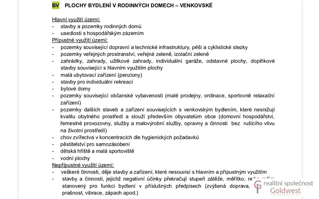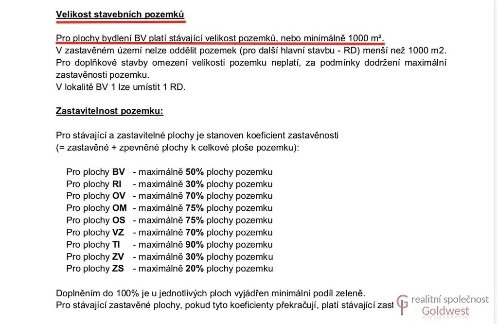 Dle územního plánu je pravá část o výměře cca. 4 900 m2 určená k zástavbě a označená BV - plochy bydlení v rodinných domech - venkovské, kdy koeficient zastavění je 50%, velikost budoucích parcel 1000 m2. Lze tedy rozdělit případně i na 3 samostatné stavební parcely.