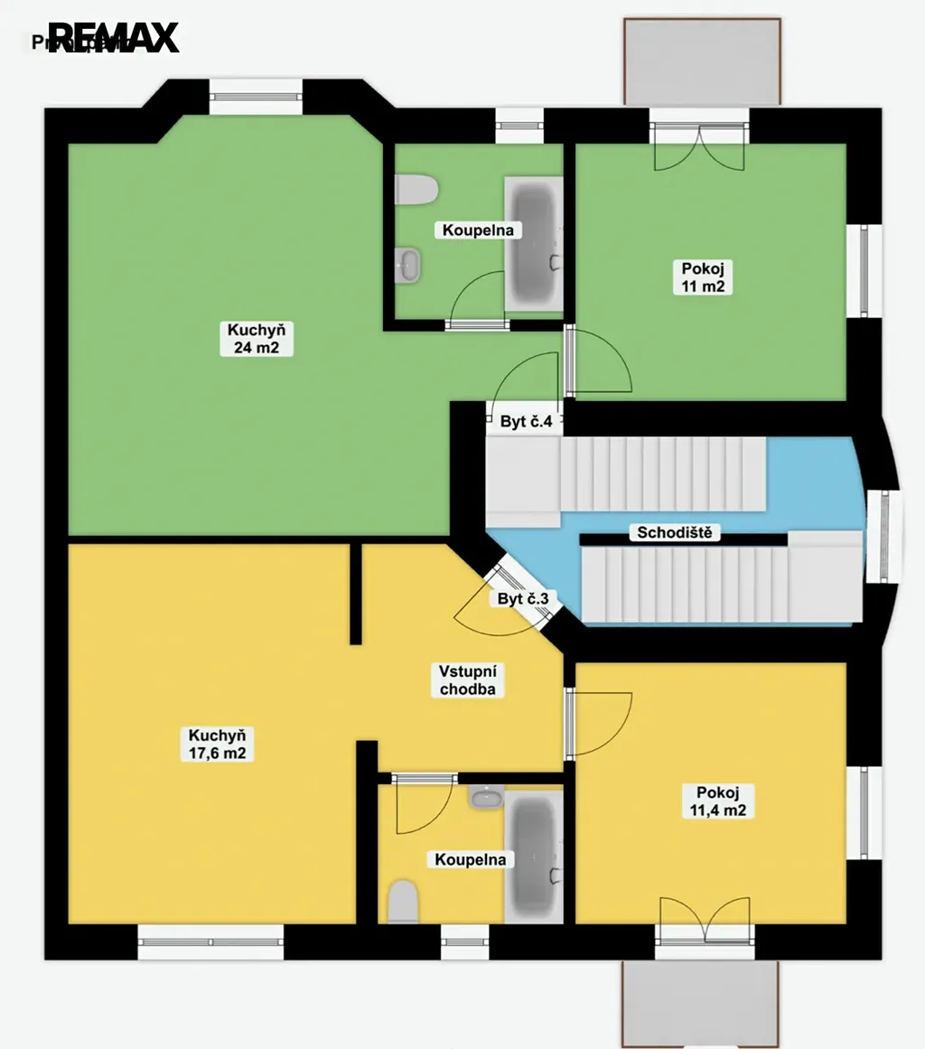Byt č. 4 (na přiloženém půdorysu) se nachází v 1. patře domu o 6 bytových jednotkách.