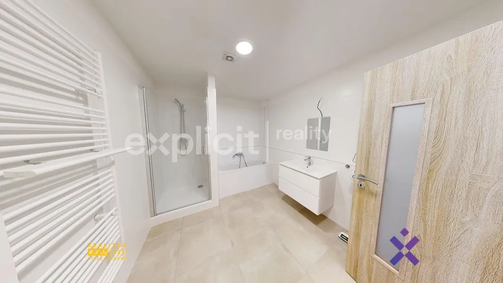Nová prostorná koupelna je vybavena sprchovým koutem i vanou, umyvadlem s umyvadlovou skříňkou na kosmetiku a místem na pračku i sušičku. WC je samostatné.