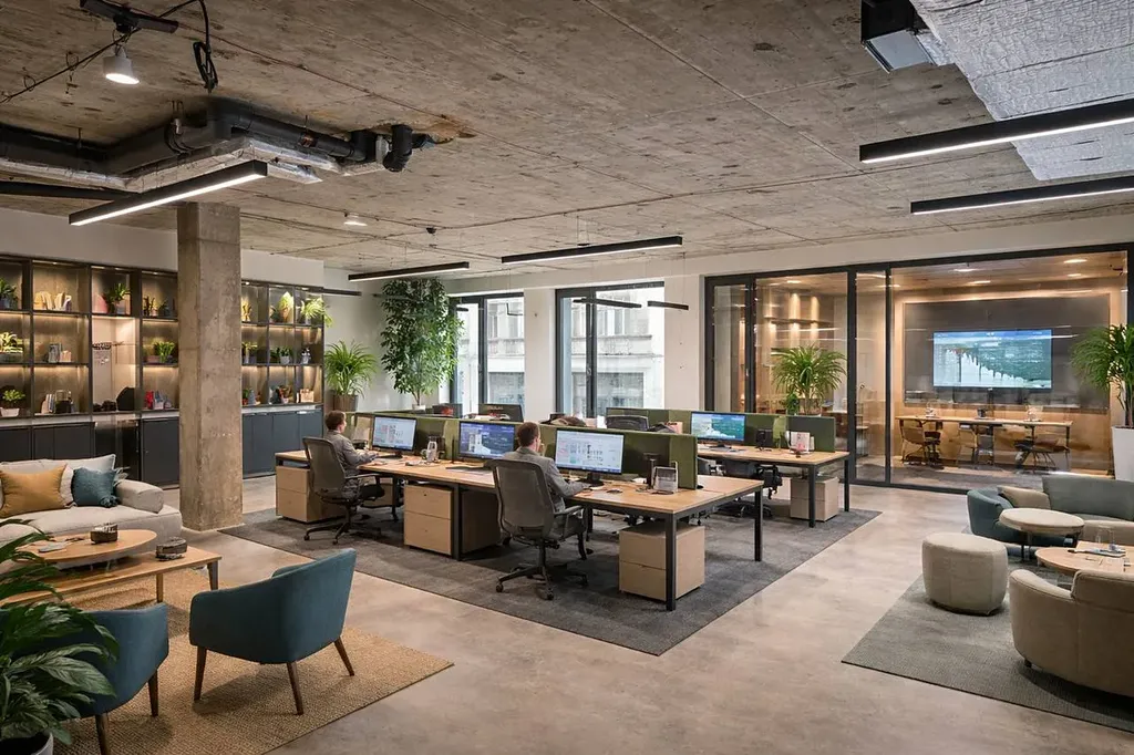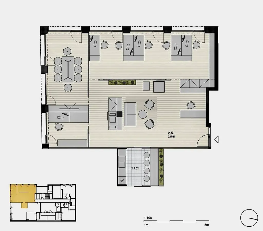 Celková plocha prostoru činí 123,15 m² s terasou, která poskytuje příjemné zázemí pro jednání s klienty i odpočinek zaměstnanců.