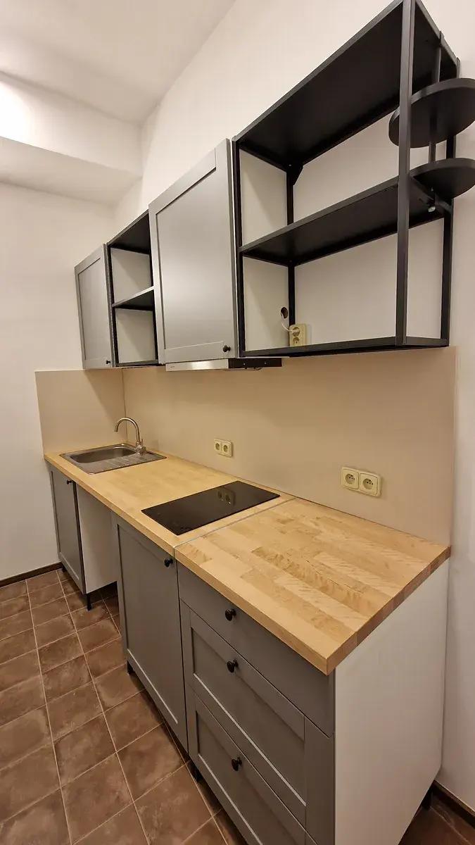 V bytě se topí elektrikou a je i klimatizovaný. Vybavený kuchyňskou linkou a samozřejmě koupelnou.