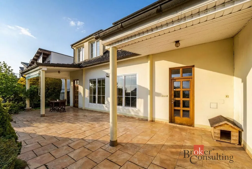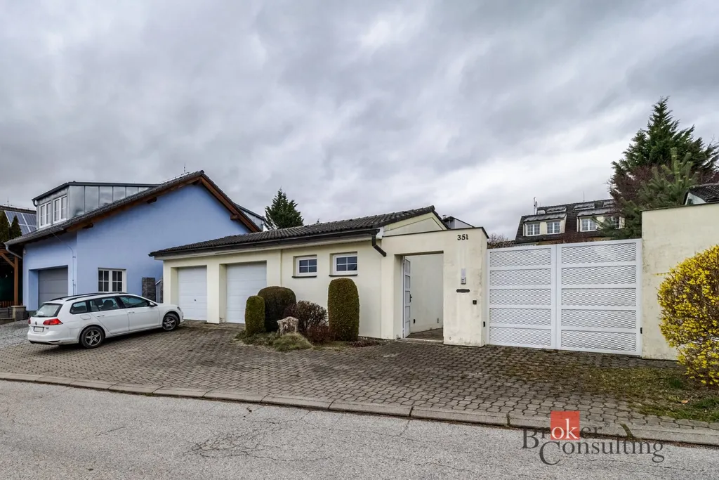 K domu vede příjezdová komunikace, kterou přijedete k prostorné dvojgaráži a vstupní branou na pozemek. Stavba je citlivě zasazena do mírného svahu a cestou ke vstupu Vás zaujme krytý venkovní bazén. Přední část domu nabízí velkorysou jižně orientovanou terasu obklopenou vzrostlou zelení, která zajišťuje dostatek soukromí i příjemné prostředí k relaxaci.