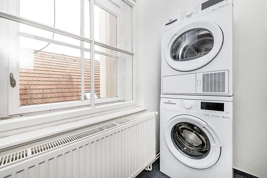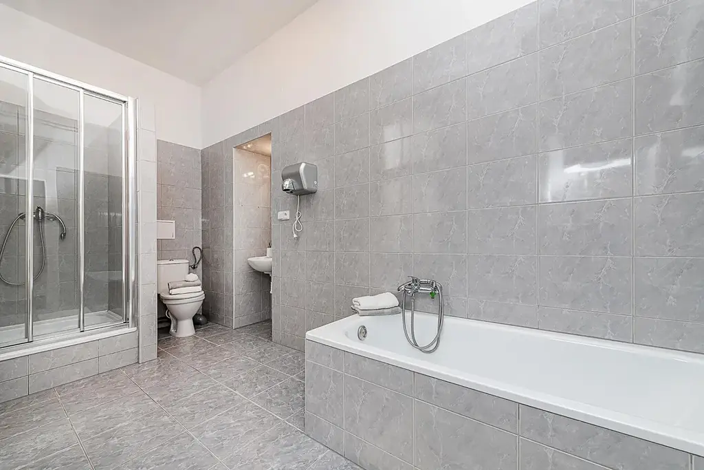 Byt je plně vybaven. Kuchyň disponuje kuchyňskou linkou včetně spotřebičů (trouba, sklokeramická varná deska, dvě myčky a dvě lednice). Koupelna je vybavena vanou, sprchovým koutem a toaletou. Další samostatná toaleta se nachází v předsíni, kde je zároveň k dispozici pračka a sušička. Vše je navrženo pro maximální komfort spolubydlení.