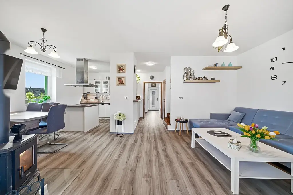 Z předností domu stojí za zmínku poctivá sedlová střecha s pálenou taškou, podlahové vytápění, vinylové podlahy, kuchyně s ostrůvkem pro vaření a litinová krbová kamna Nordflam.