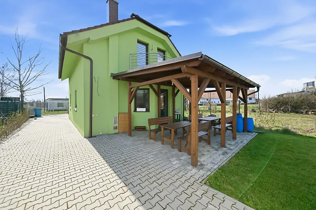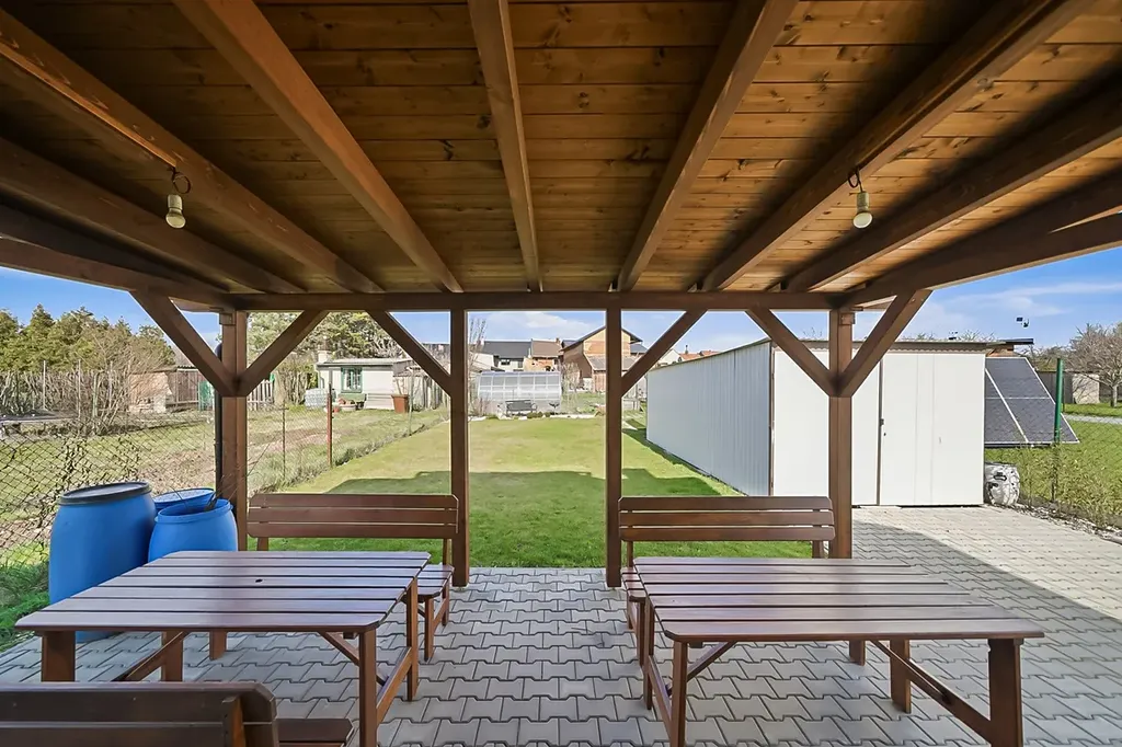 Z obývacího pokoje je přímý vstup na zastřešenou terasu. Zahrada o výměře 656 m² je orientovaná na jihozápad. Na pozemku se nachází vlastní studna.