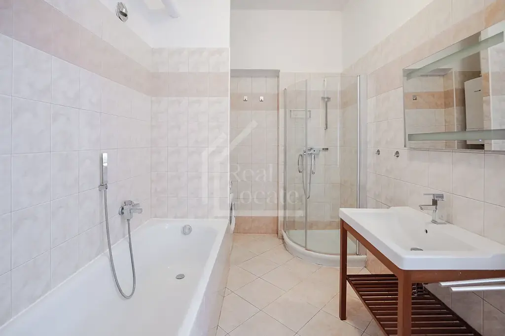 Interiér bytu definuje centrální chodba, která zajišťuje komfortní vstup do jednotlivých místností. Dispozice zahrnuje tři prostorné ložnice, reprezentativní obývací pokoj, plně vybavenou kuchyni z masivu, koupelnu s vanou i sprchovým koutem, samostatnou toaletu a praktickou komoru. Výjimečnou atmosféru a vzdušnost prostoru dodávají stropy vysoké přes 4 metry a nádherná, citlivě repasovaná okna.