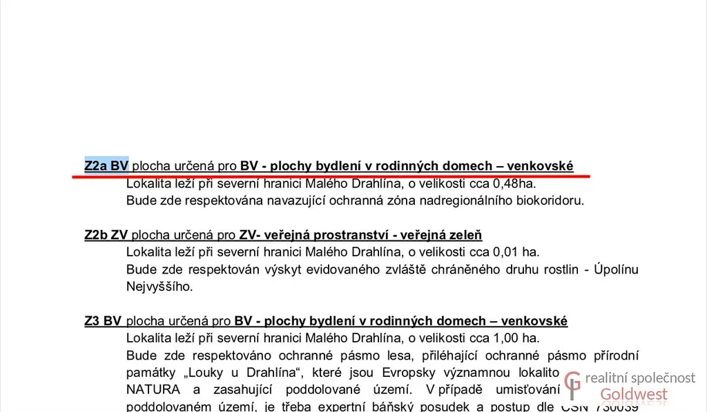 Dle územního plánu je pravá část o výměře cca. 4 900 m² určená k zástavbě a označená BV - plochy bydlení v rodinných domech - venkovské, kdy koeficient zastavění je 50%, velikost budoucích parcel 1000 m². Lze tedy rozdělit případně i na 3 samostatné stavební parcely.
