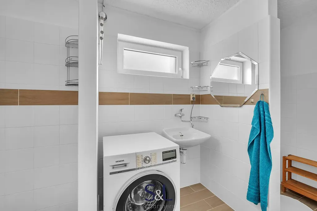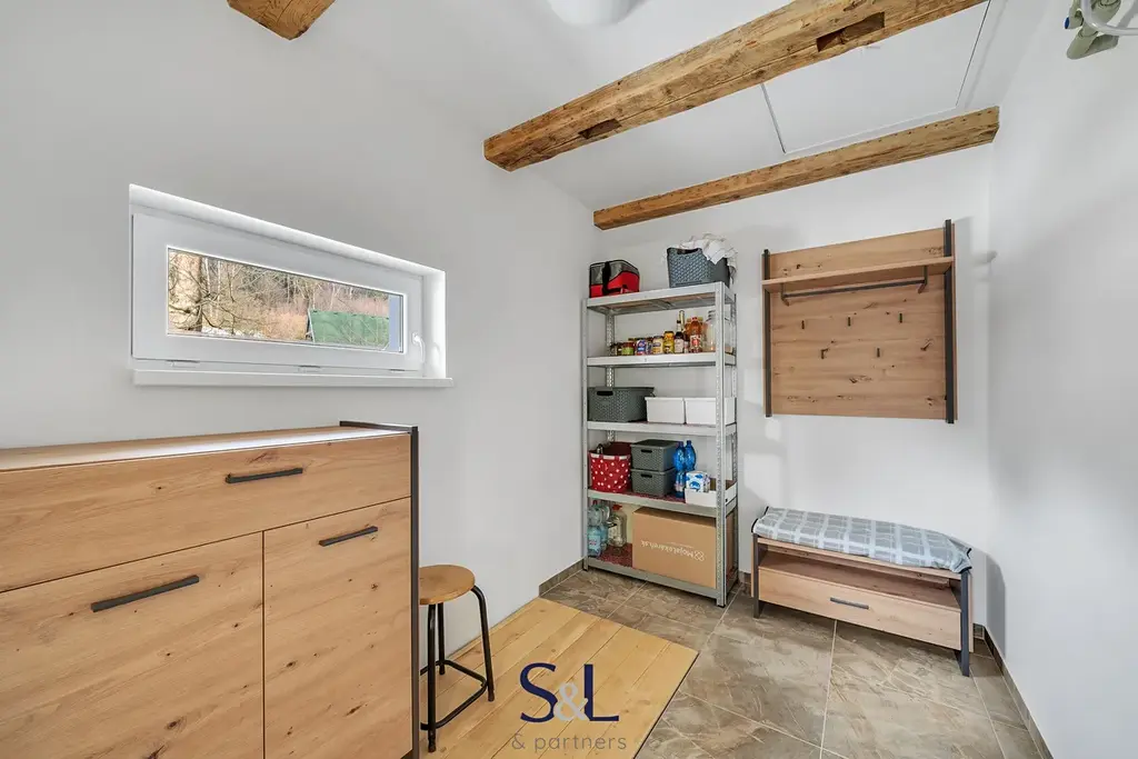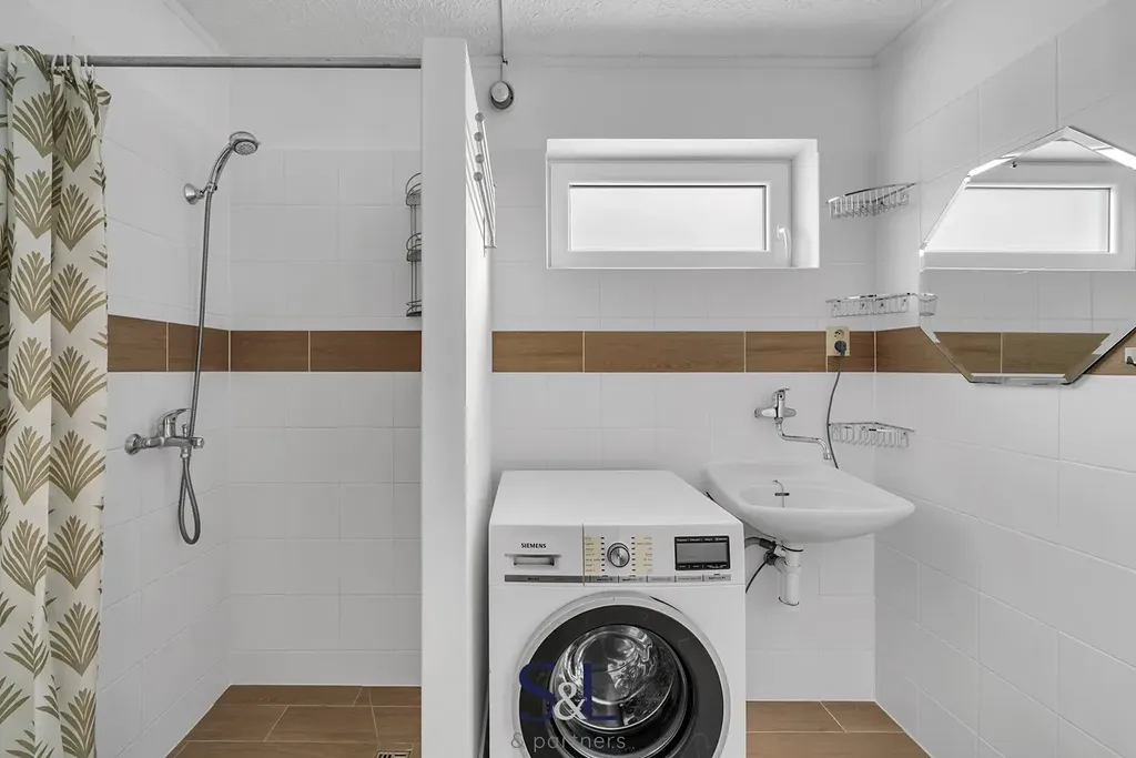 Dále je v přízemí domu koupelna se sprchovým koutem a velká předsíň.