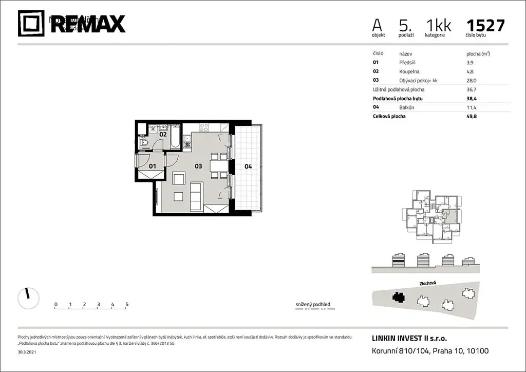Byt se nachází ve 5. patře se celkovou podlahovou plochou 38,3 m².